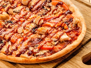 бекон, перец болгарский, помидор, шампиньоны, курица, моцарелла, соус bbq, соус жульен