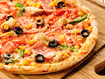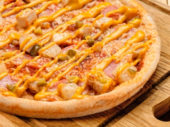 колбаски охотничьи, перец болгарский, ветчина, маслины, помидор, моцарелла, соус фирменный