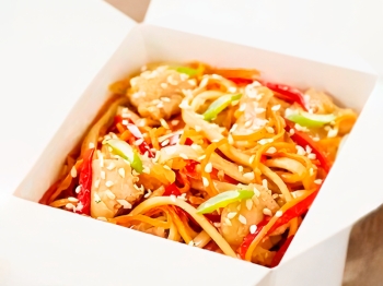 курица, лапша рисовая, цукини, перец болгарский, морковь, шампиньоны, кунжут, соус терияки