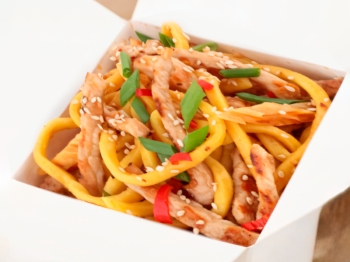 курица, лапша пшеничная, цукини, перец болгарский, морковь, шампиньоны, кунжут, соус терияки