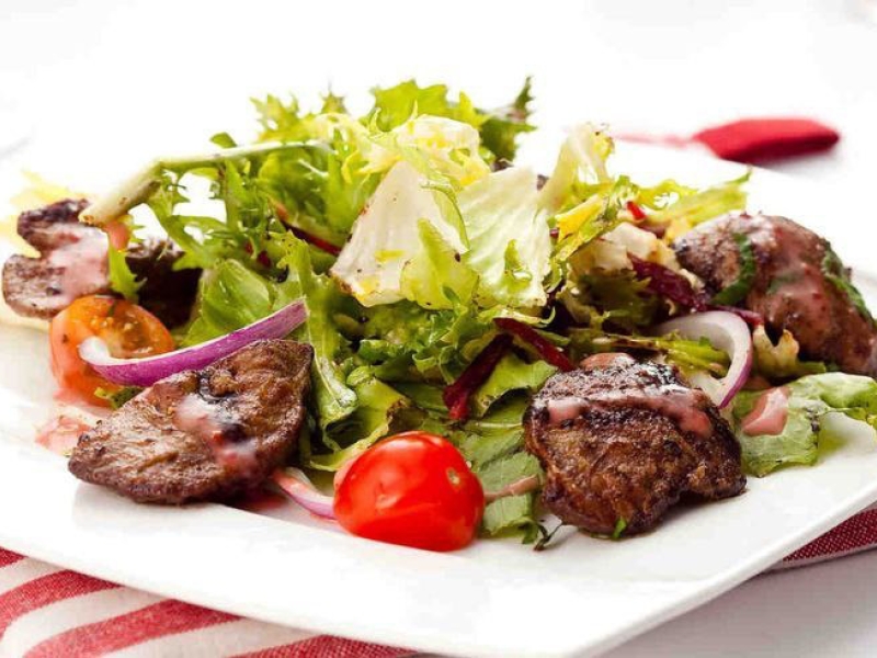 Салат с куриной печенью и беконом